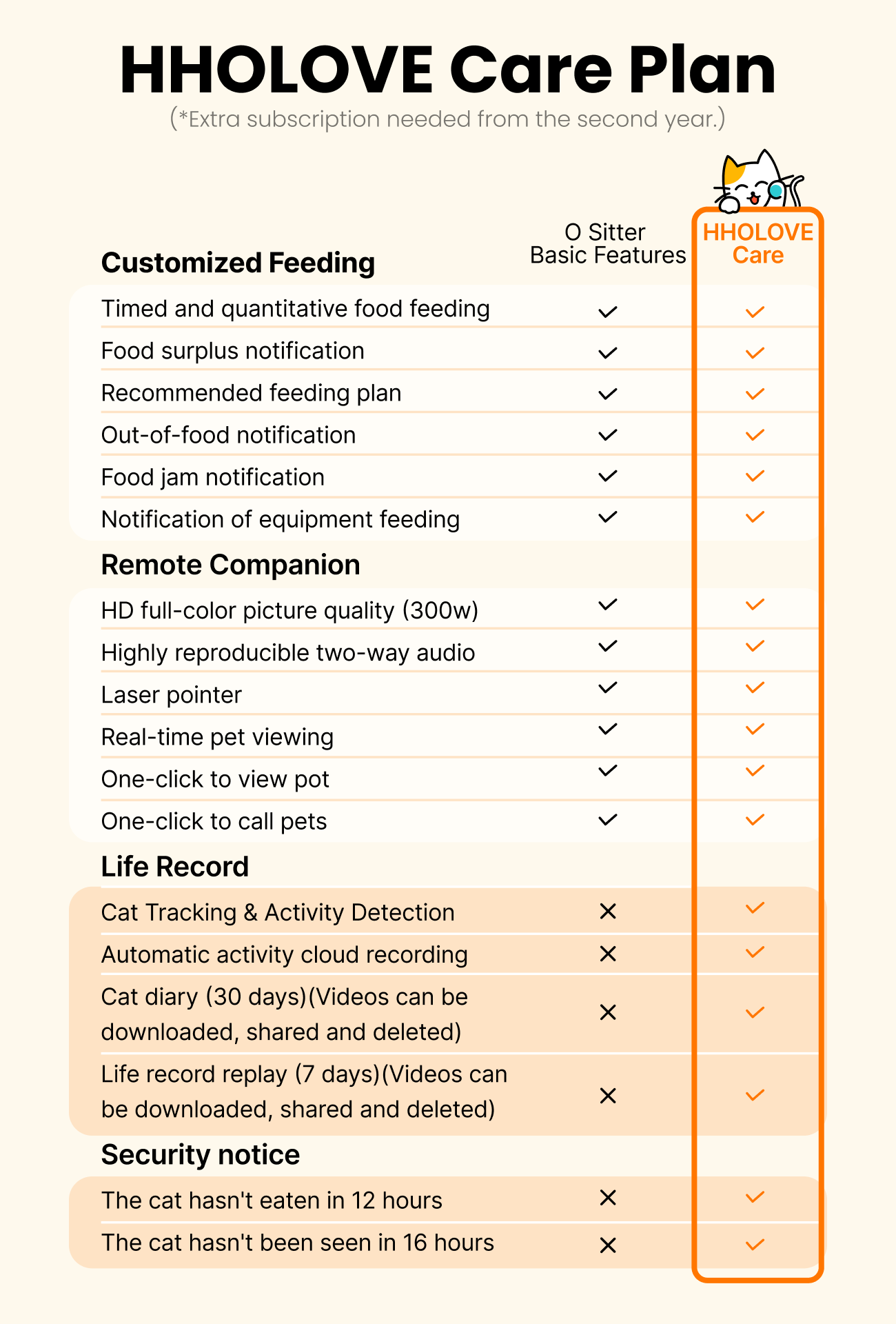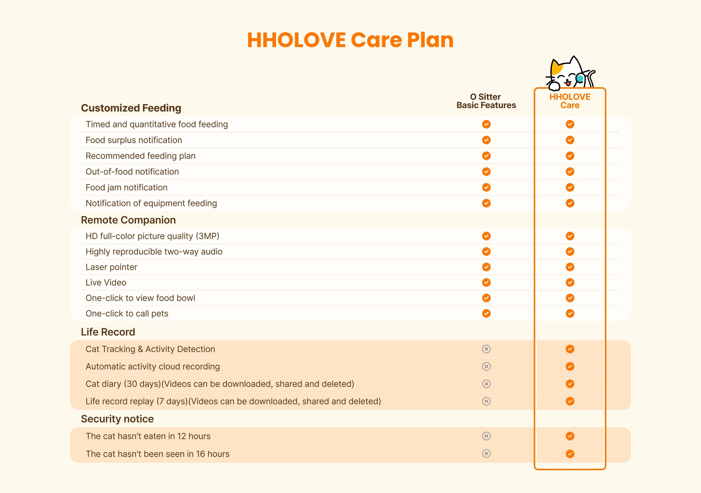 No more worries about running out of food. O Sitter will alert you when food is running low. Plus, O Sitter will see the food bowl when time to feed and not dispense if food is still enough in the bowl. For any green hand, just input your cat’s basic information and O Sitter will automatically recommend a feeding plan to you, making cat care a breeze.