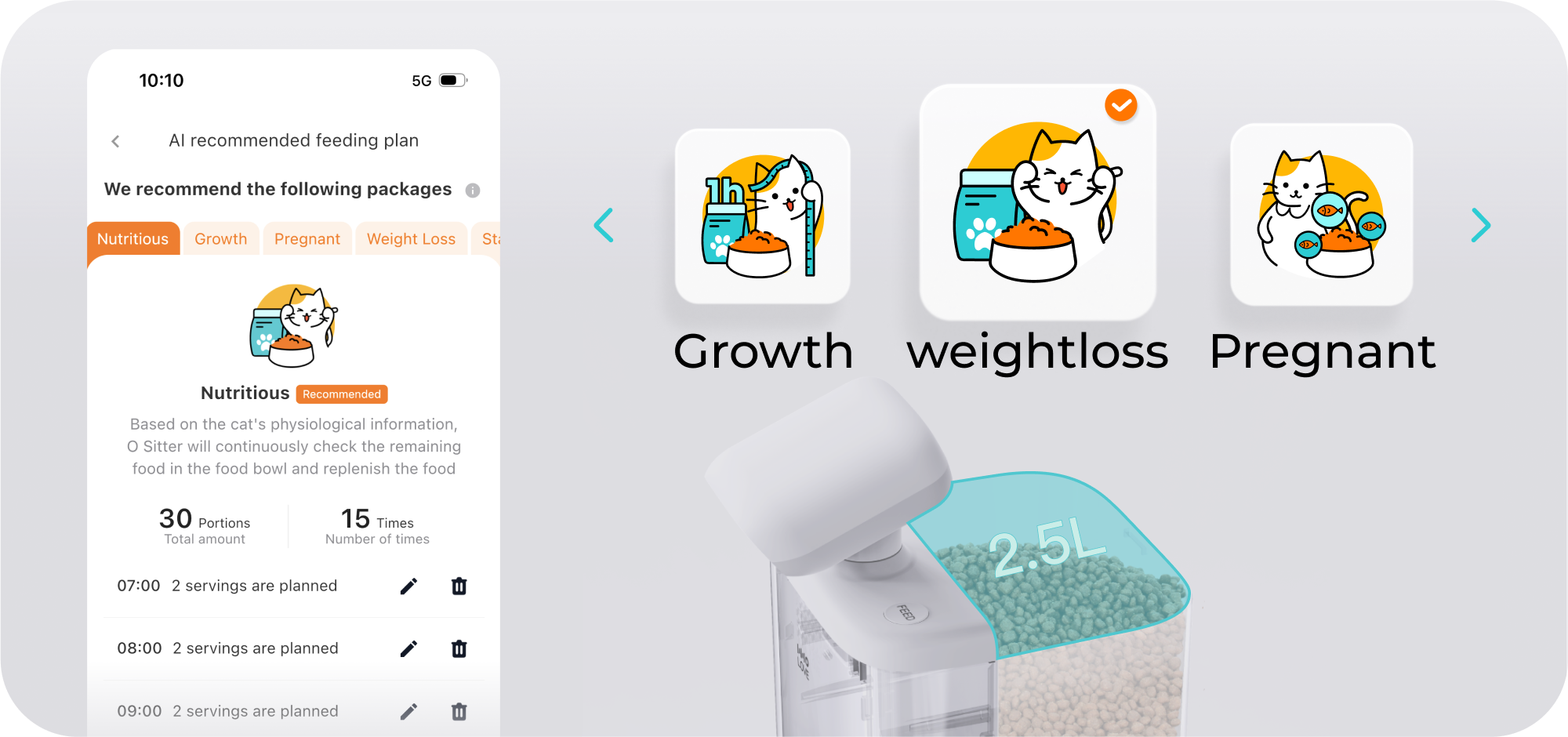 No more worries about running out of food. O Sitter will alert you when food is running low. Plus, O Sitter will see the food bowl when time to feed and not dispense if food is still enough in the bowl. For any green hand, just input your cat’s basic information and O Sitter will automatically recommend a feeding plan to you, making cat care a breeze.