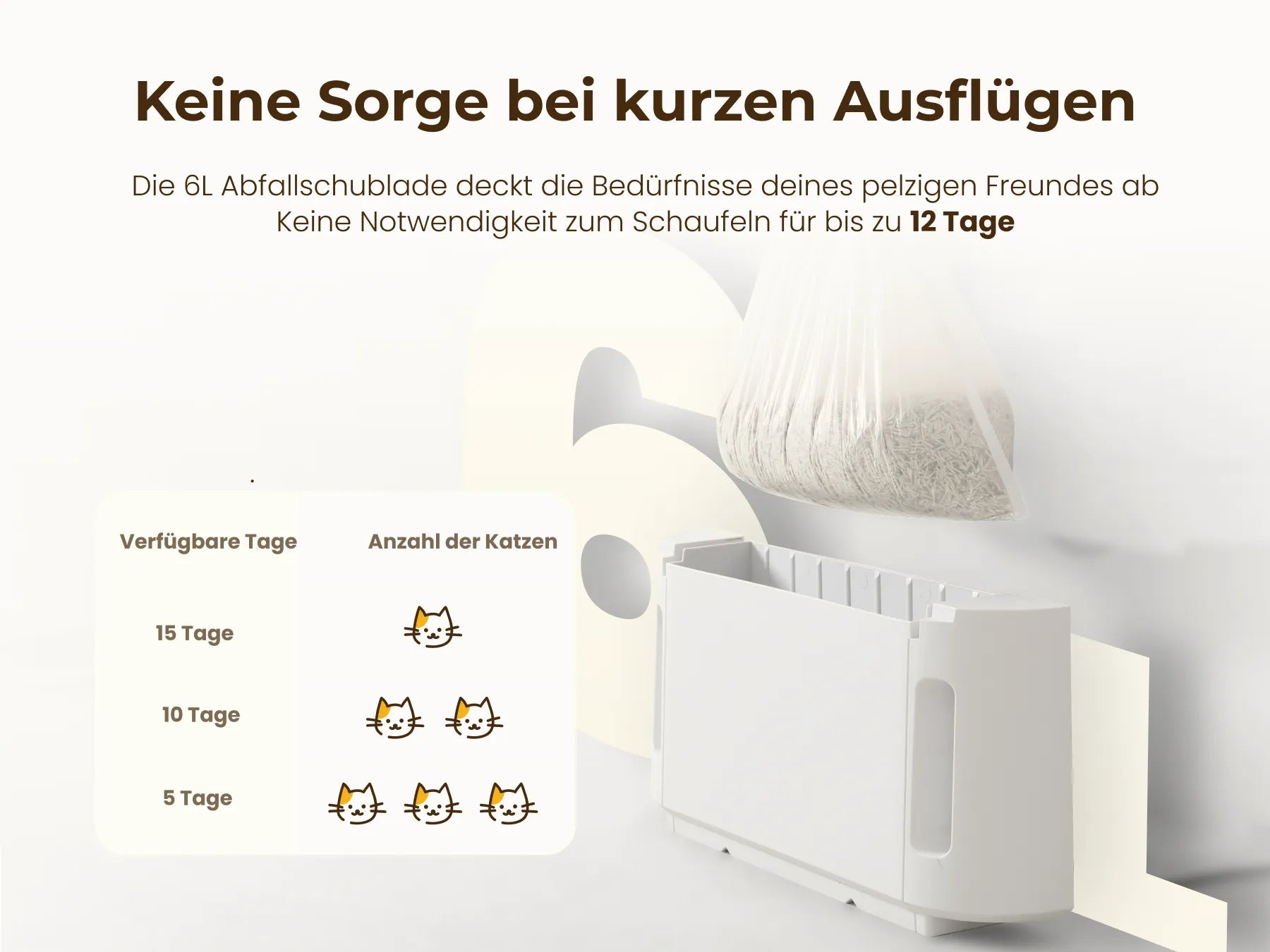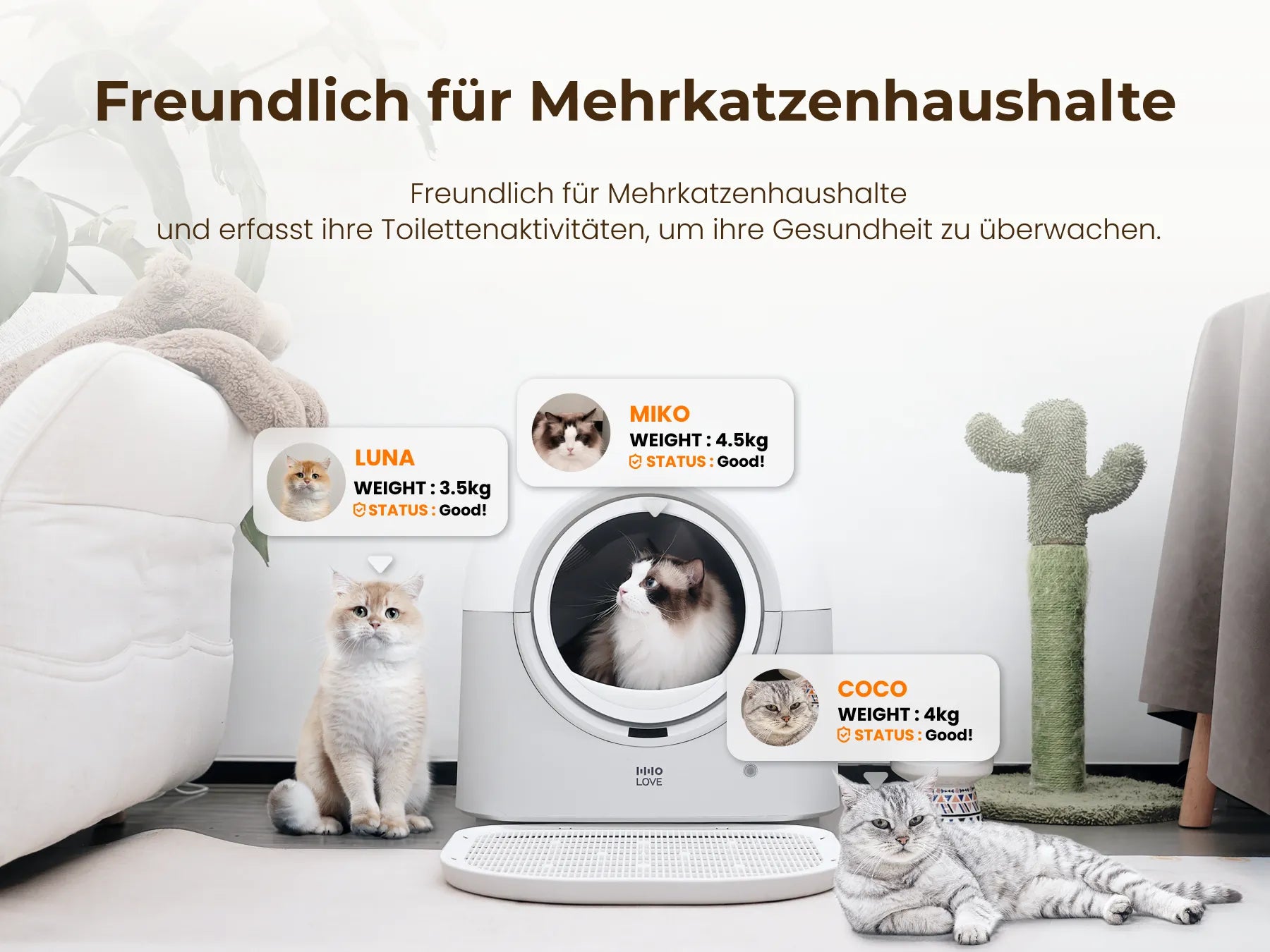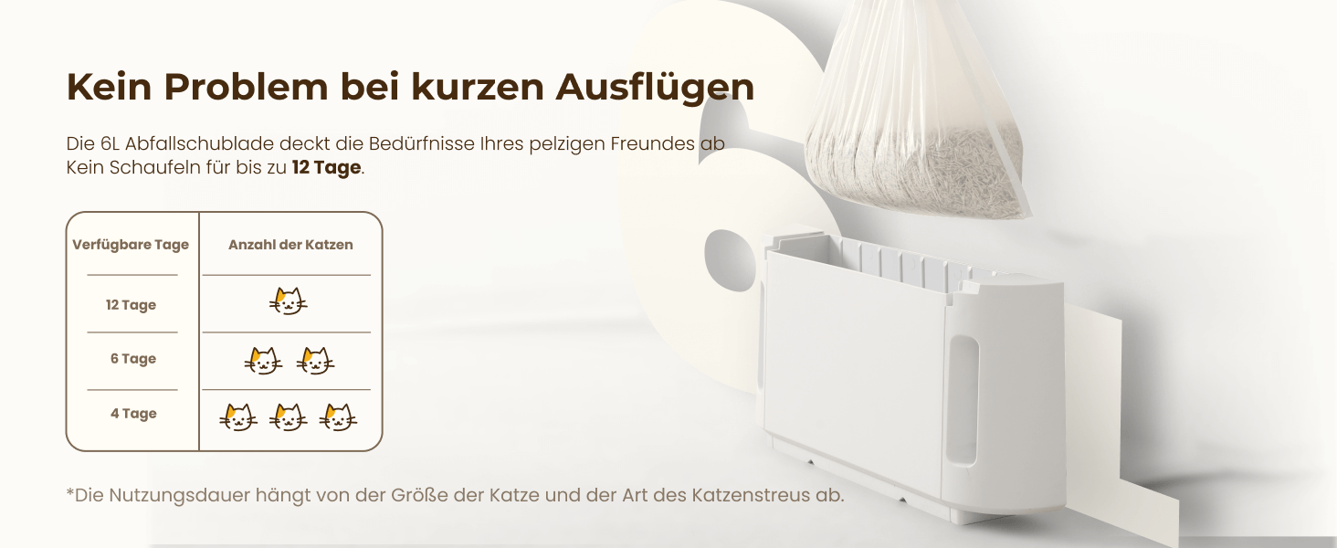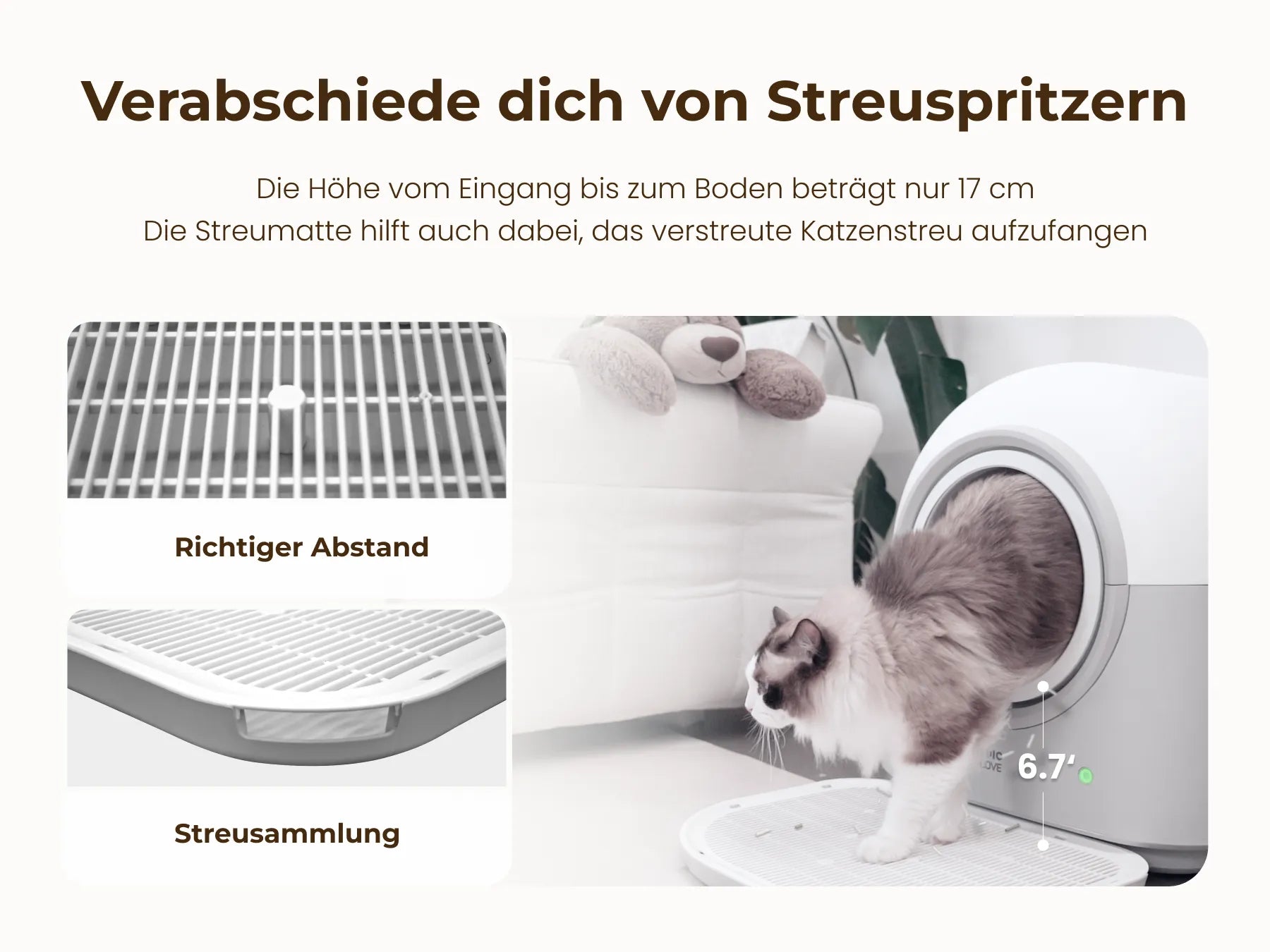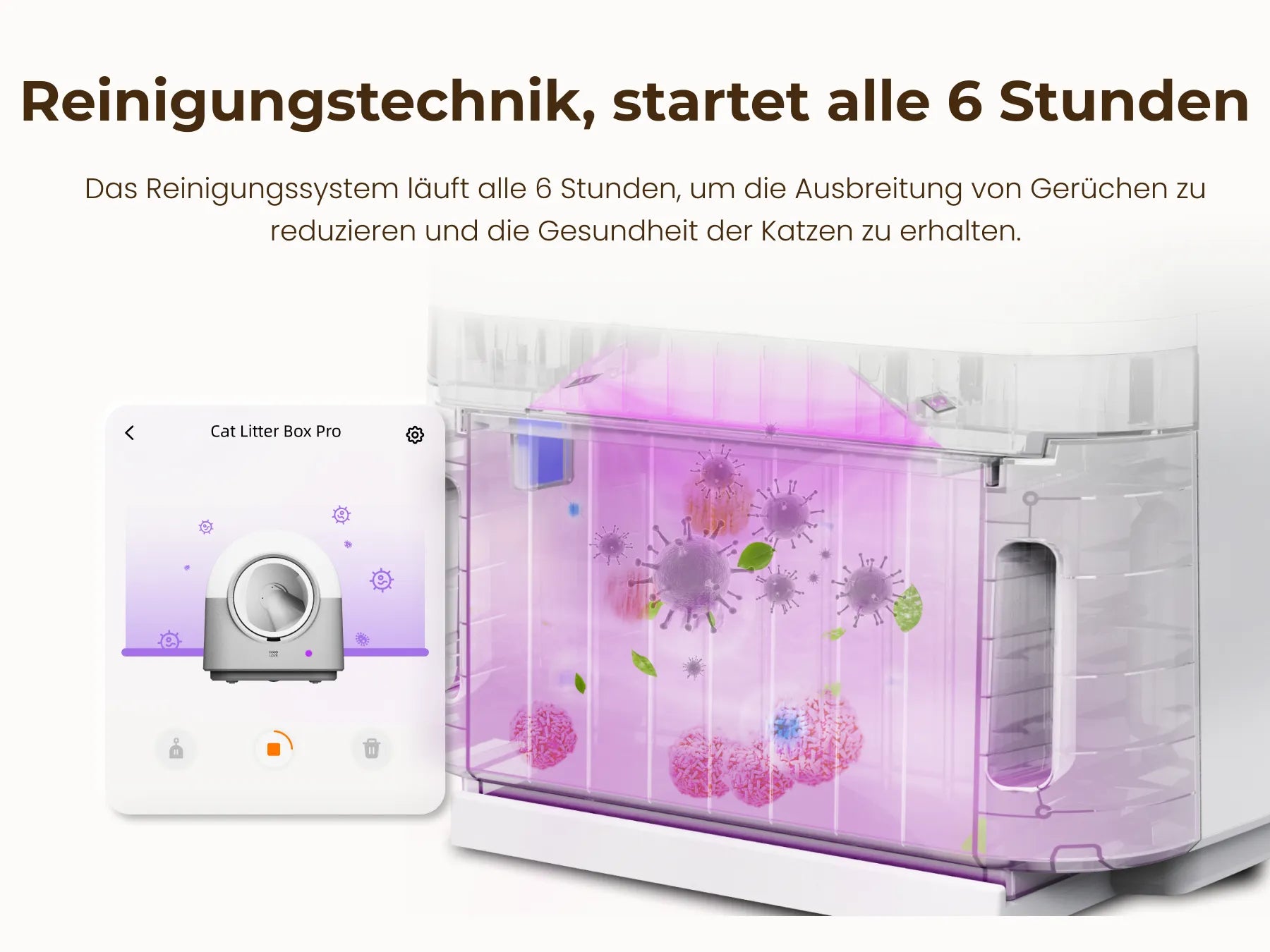 Ich besitze es jetzt seit einem Monat und bin sehr zufrieden damit. Ich habe in der Vergangenheit kleine Roboter ausprobiert und musste sie zurückgeben, weil meine Katze zu groß dafür war. Jahre später gebe ich dieser unbekannten Marke eine Chance. Es funktioniert einwandfrei! Die App überwacht, wie oft meine Katze die Katzentoilette benutzt, wie lange es dauert, wann der Abfallbehälter voll ist und wann es Zeit ist, die Streu zu wechseln. Ich benutze billige leichte Streu von Walmart und mag es, dass ich mit der App die Zykluszeit ändern kann, damit die Streu genug Zeit hat, sich zu verfestigen, damit sie nicht an anderen Oberflächen kleben bleibt. Meine Katze ist ein Gräber und hinterlässt großen Abfall. Manchmal kann er 2 Minuten darin sein. Ich hatte einige Probleme damit, dass die Streu am Boden klebte, was jedoch kein Problem ist, da es sich alle zwei Wochen leicht reinigen lässt, wenn es Zeit ist, die Streu zu wechseln. Wieder benutze ich günstige leichte Streu von Walmart. Ich bin sicher, dass Premium-Streu besser funktioniert. Ich konnte das Problem beheben, indem ich alle Innenflächen mit einem trockenen, lebensmittelgeeigneten Silikonspray von CRC besprüht habe. Die mitgelieferten Beutel mit Kordelzug sind ein Plus. Ich weiß, dass man auch andere Beutel verwenden kann (wie Walmart-Einkaufstüten), aber sie machen es so einfach, warum ändern? Schließlich habe ich diese automatische Katzentoilette gekauft, um mein Leben zu erleichtern. Meine Katze benutzt die Katzentoilette drei- bis viermal am Tag und hinterlässt viel Abfall. Die App lässt mich wissen, wann der Abfallbehälter voll ist, und das dauert in der Regel 9 Tage. Normalerweise hinterlasse ich keine Bewertungen, es sei denn, ich finde das Produkt hervorragend oder es muss vor einem Kauf gewarnt werden. Dies ist etwas, worauf man stolz sein kann. Du wirst deine Freunde beeindrucken, wenn du ihnen die Funktionalität der Katzentoilette mit der App zeigst. Jeder, dem ich das gezeigt habe und der eine Wohnungskatze hat, hat sich auch eine gekauft. Außerdem habe ich gerade Beutel auf ihrer Website bestellt. Es gab Angebote und Rabatte, die ich nur auf ihrer Website nutzen konnte. Es war günstiger als der Preis auf Amazon. Sie behaupten, es gibt einen UV-Sanitizer. Du musst ihn in der App aktivieren, damit er automatisch läuft. Ich bin mir nicht sicher, weil ich keinen Glanz sehe, wenn ich ihn einschalte. Es gibt keine Anweisungen, wie man es ersetzt, und ich sehe auch keine zum Verkauf. Ich weiß nicht, ob es die Streu desinfiziert oder den Geruch im Abfallbehälter beseitigt. Ich schalte es manuell ein, wenn die Katze einen schlimmen Haufen hinterlassen hat. Ich weiß nicht, ob der Geruch einfach mit der Zeit verschwindet oder ob der Sanitizer es erledigt hat. Überraschenderweise riecht die Katzentoilette normalerweise nicht, selbst wenn der Abfallbehälter fast voll ist. Es sagt dir, dass du den Abfallbehälter leeren sollst, bevor er überläuft, um Schmieren zu vermeiden. Ich glaube, mit der Behandlung der lebensmitteltauglichen Silikonspraybehandlung werde ich es diesmal nicht auseinandernehmen müssen, um es nach vierzehn Tagen zu reinigen. Nichts bleibt an den Oberflächen haften. Die Katzentoilette ist ein gutes Produkt.