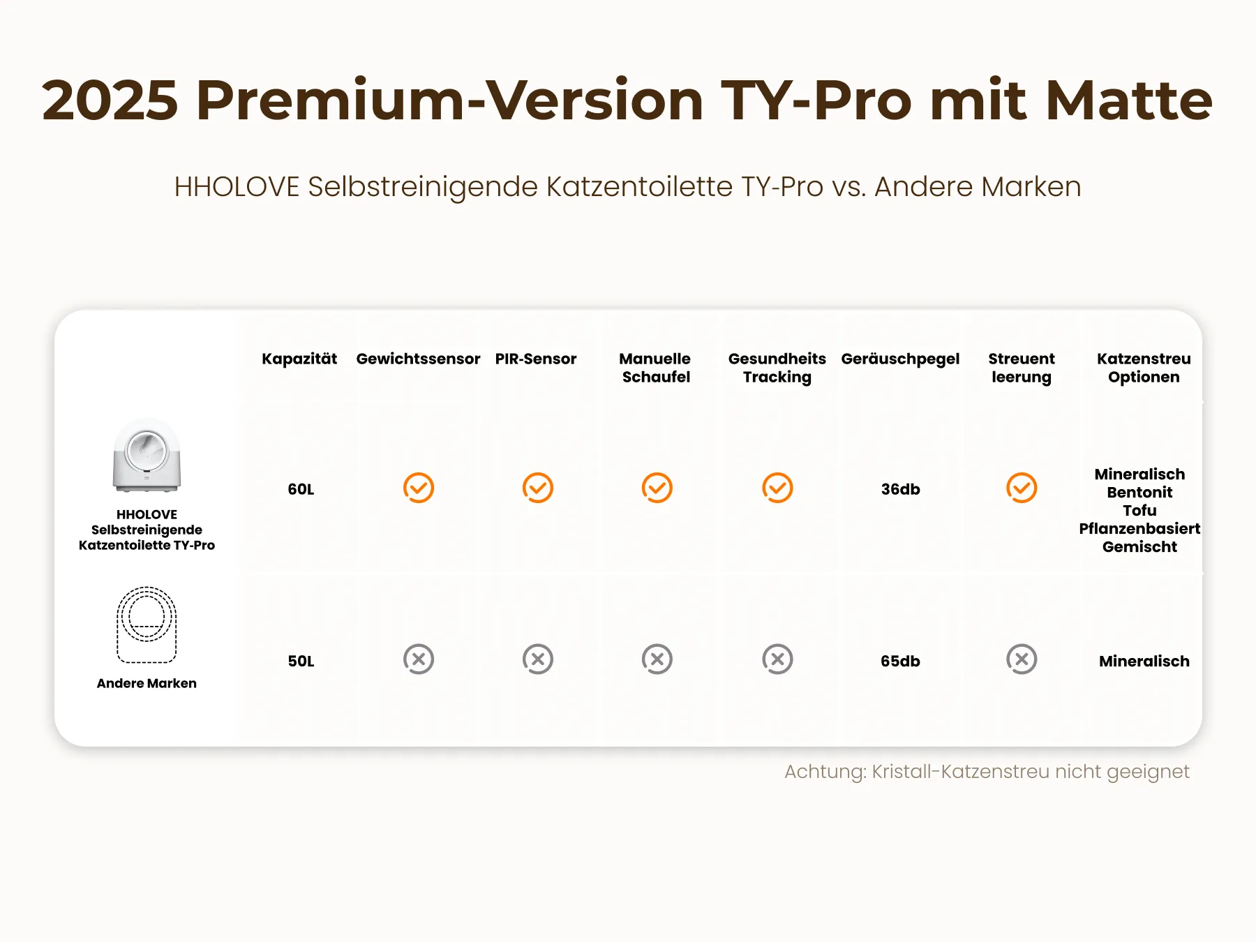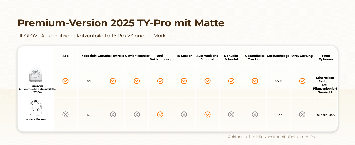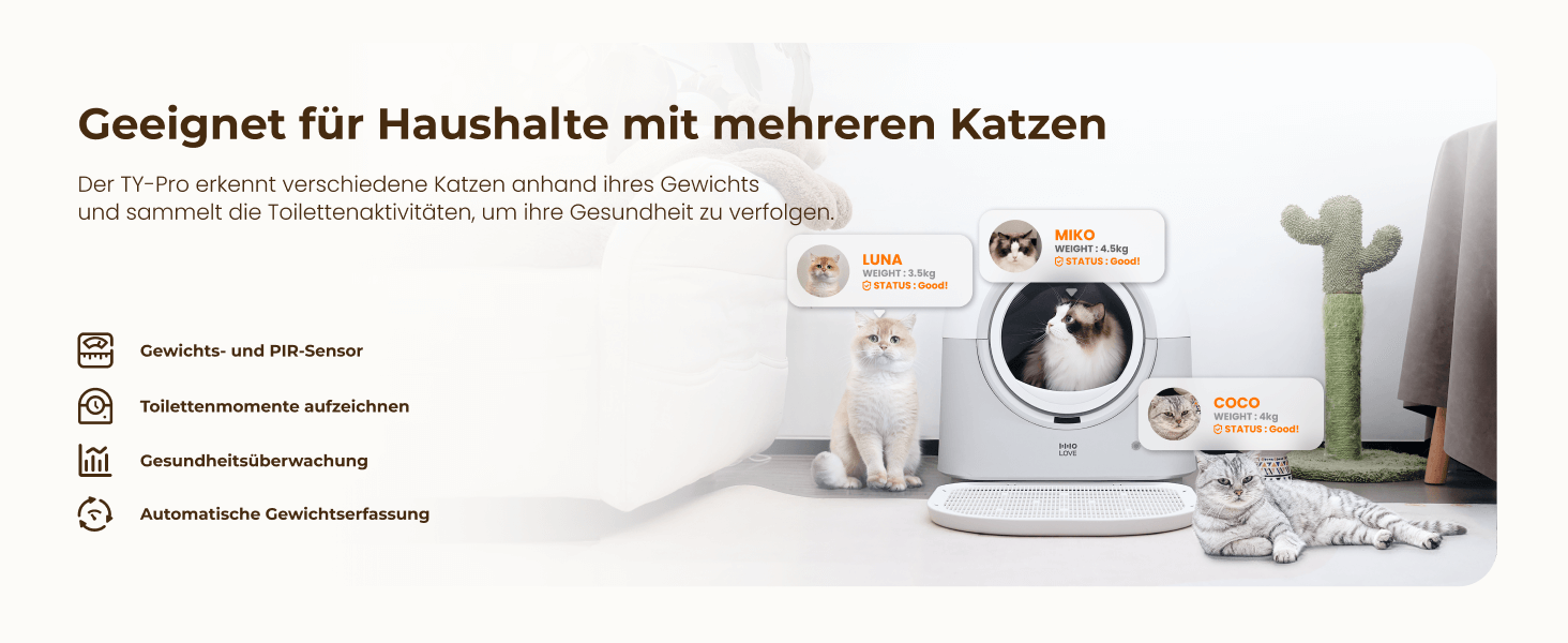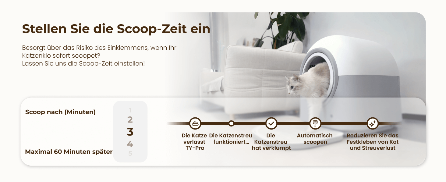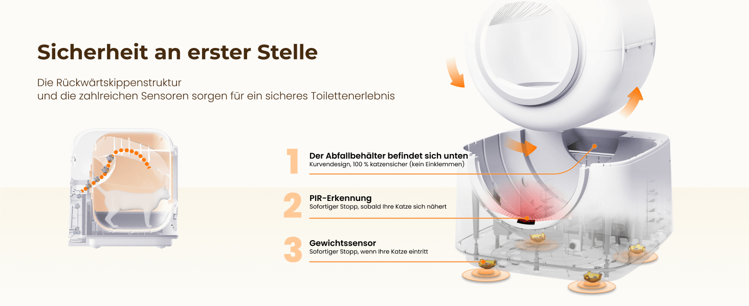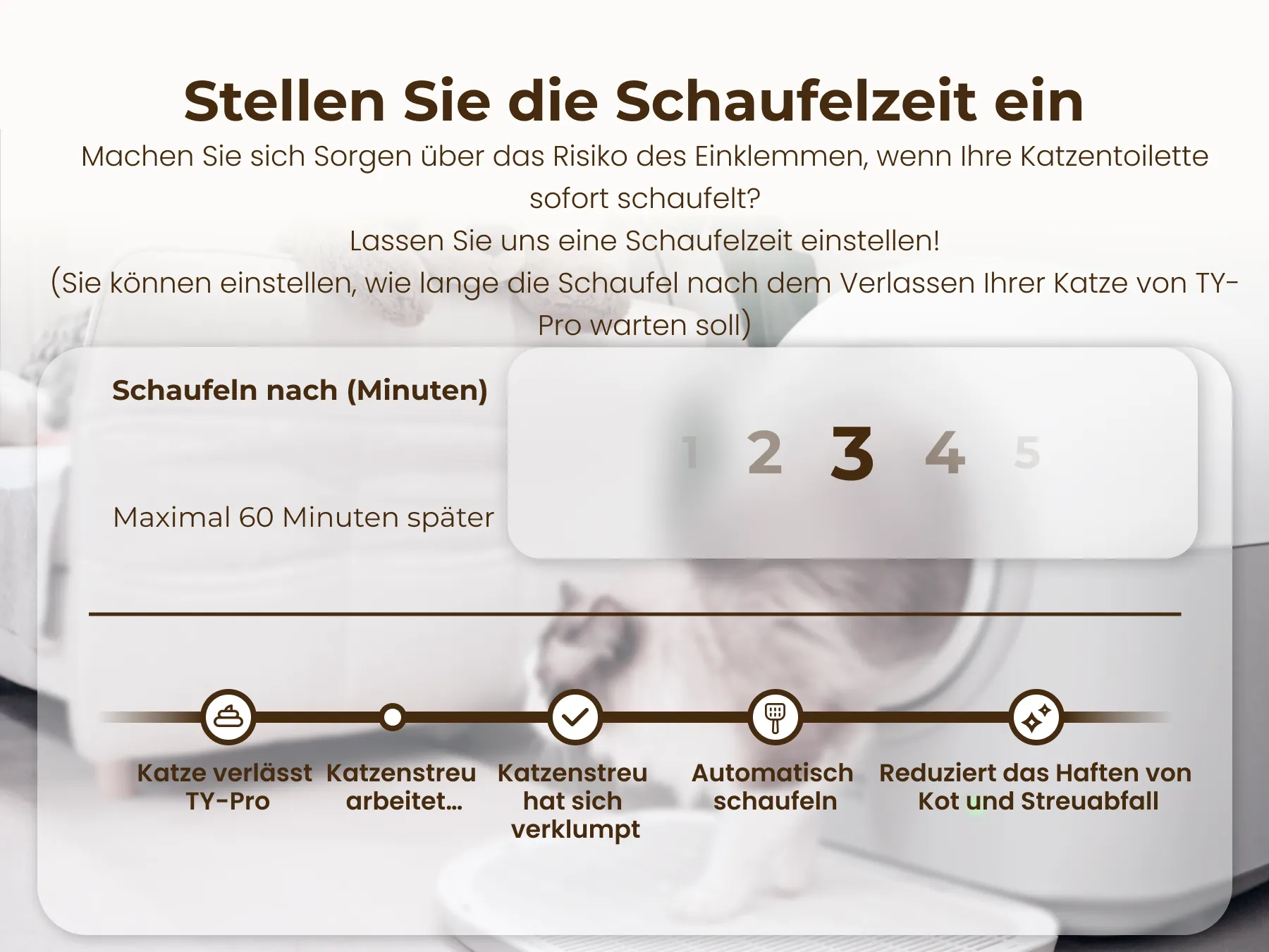 Ich besitze es jetzt seit einem Monat und bin sehr zufrieden damit. Ich habe in der Vergangenheit kleine Roboter ausprobiert und musste sie zurückgeben, weil meine Katze zu groß dafür war. Jahre später gebe ich dieser unbekannten Marke eine Chance. Es funktioniert einwandfrei! Die App überwacht, wie oft meine Katze die Katzentoilette benutzt, wie lange es dauert, wann der Abfallbehälter voll ist und wann es Zeit ist, die Streu zu wechseln. Ich benutze billige leichte Streu von Walmart und mag es, dass ich mit der App die Zykluszeit ändern kann, damit die Streu genug Zeit hat, sich zu verfestigen, damit sie nicht an anderen Oberflächen kleben bleibt. Meine Katze ist ein Gräber und hinterlässt großen Abfall. Manchmal kann er 2 Minuten darin sein. Ich hatte einige Probleme damit, dass die Streu am Boden klebte, was jedoch kein Problem ist, da es sich alle zwei Wochen leicht reinigen lässt, wenn es Zeit ist, die Streu zu wechseln. Wieder benutze ich günstige leichte Streu von Walmart. Ich bin sicher, dass Premium-Streu besser funktioniert. Ich konnte das Problem beheben, indem ich alle Innenflächen mit einem trockenen, lebensmittelgeeigneten Silikonspray von CRC besprüht habe. Die mitgelieferten Beutel mit Kordelzug sind ein Plus. Ich weiß, dass man auch andere Beutel verwenden kann (wie Walmart-Einkaufstüten), aber sie machen es so einfach, warum ändern? Schließlich habe ich diese automatische Katzentoilette gekauft, um mein Leben zu erleichtern. Meine Katze benutzt die Katzentoilette drei- bis viermal am Tag und hinterlässt viel Abfall. Die App lässt mich wissen, wann der Abfallbehälter voll ist, und das dauert in der Regel 9 Tage. Normalerweise hinterlasse ich keine Bewertungen, es sei denn, ich finde das Produkt hervorragend oder es muss vor einem Kauf gewarnt werden. Dies ist etwas, worauf man stolz sein kann. Du wirst deine Freunde beeindrucken, wenn du ihnen die Funktionalität der Katzentoilette mit der App zeigst. Jeder, dem ich das gezeigt habe und der eine Wohnungskatze hat, hat sich auch eine gekauft. Außerdem habe ich gerade Beutel auf ihrer Website bestellt. Es gab Angebote und Rabatte, die ich nur auf ihrer Website nutzen konnte. Es war günstiger als der Preis auf Amazon. Sie behaupten, es gibt einen UV-Sanitizer. Du musst ihn in der App aktivieren, damit er automatisch läuft. Ich bin mir nicht sicher, weil ich keinen Glanz sehe, wenn ich ihn einschalte. Es gibt keine Anweisungen, wie man es ersetzt, und ich sehe auch keine zum Verkauf. Ich weiß nicht, ob es die Streu desinfiziert oder den Geruch im Abfallbehälter beseitigt. Ich schalte es manuell ein, wenn die Katze einen schlimmen Haufen hinterlassen hat. Ich weiß nicht, ob der Geruch einfach mit der Zeit verschwindet oder ob der Sanitizer es erledigt hat. Überraschenderweise riecht die Katzentoilette normalerweise nicht, selbst wenn der Abfallbehälter fast voll ist. Es sagt dir, dass du den Abfallbehälter leeren sollst, bevor er überläuft, um Schmieren zu vermeiden. Ich glaube, mit der Behandlung der lebensmitteltauglichen Silikonspraybehandlung werde ich es diesmal nicht auseinandernehmen müssen, um es nach vierzehn Tagen zu reinigen. Nichts bleibt an den Oberflächen haften. Die Katzentoilette ist ein gutes Produkt.