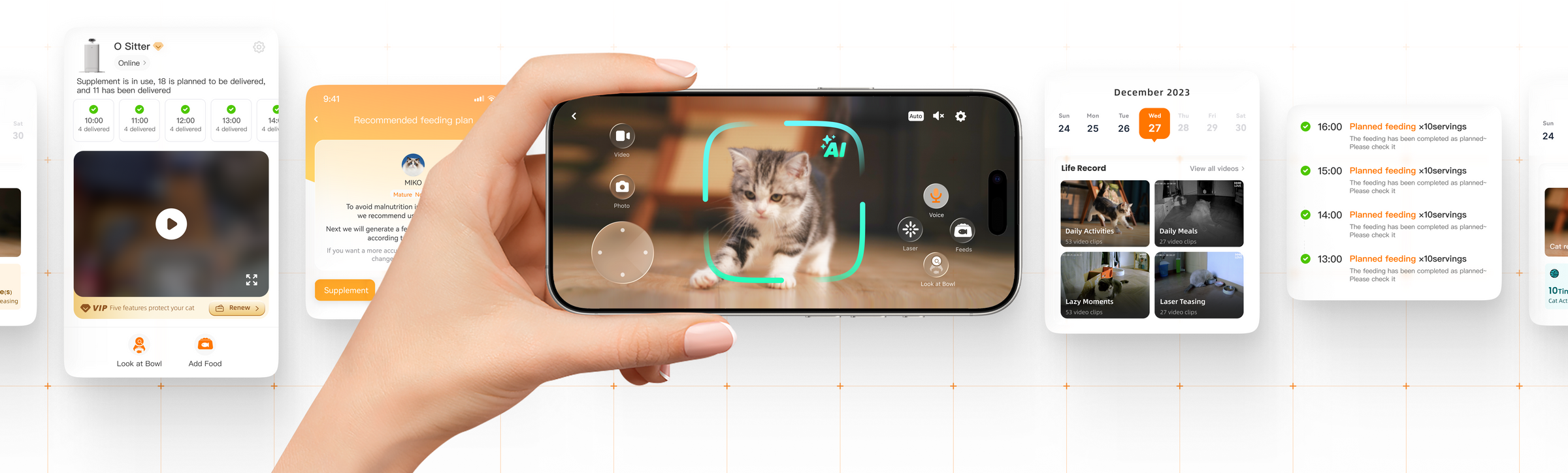 No more worries about running out of food. O Sitter will alert you when food is running low. Plus, O Sitter will see the food bowl when time to feed and not dispense if food is still enough in the bowl. For any green hand, just input your cat’s basic information and O Sitter will automatically recommend a feeding plan to you, making cat care a breeze.