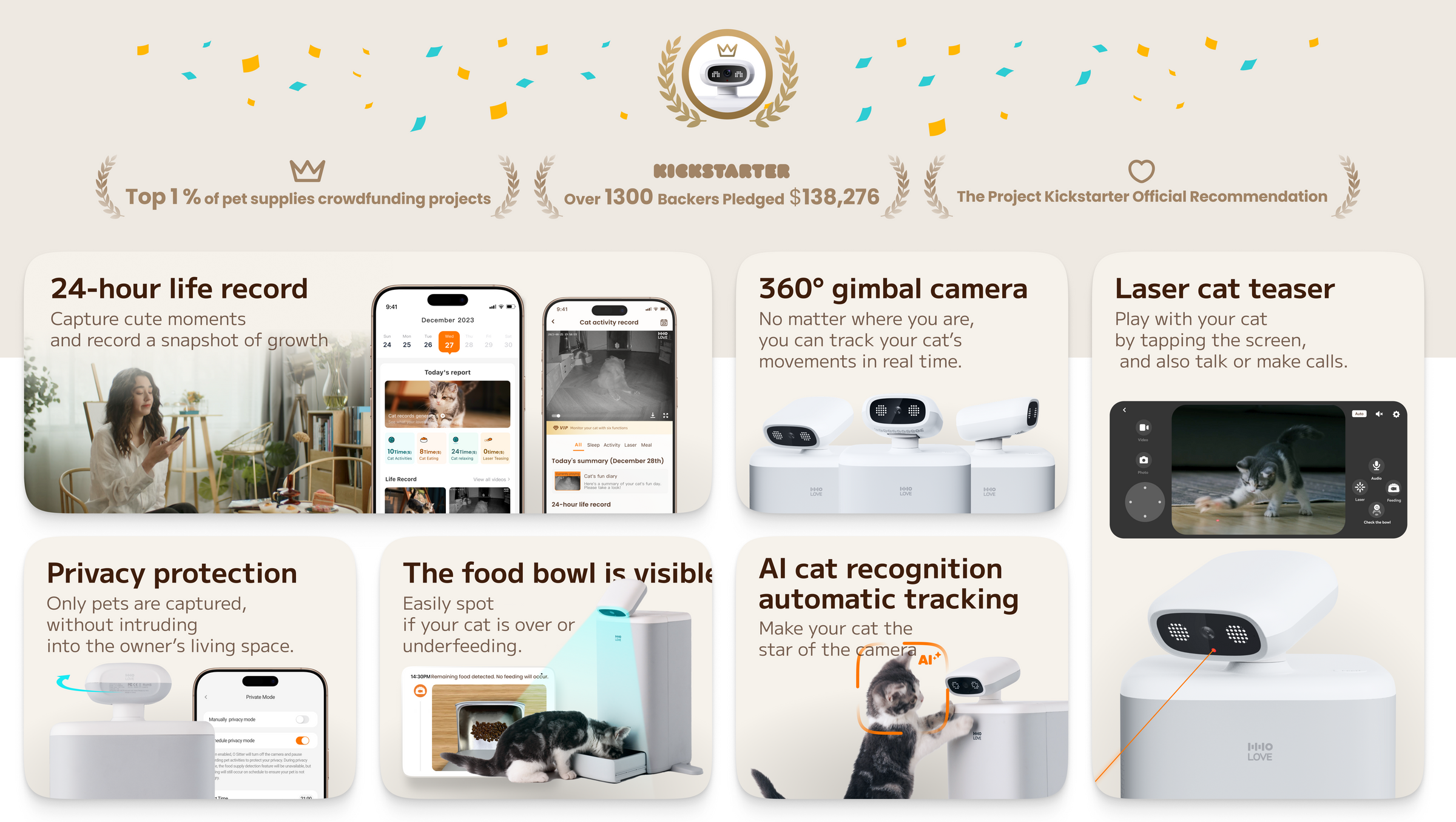 O Sitter camera can rotate 360 degrees horizontally and tilt 110 degrees vertically. Easily control the camera via HHOLOVE App and find out your cat even it hides in the corner. No matter how naughty your cat is, every moment will be captured.