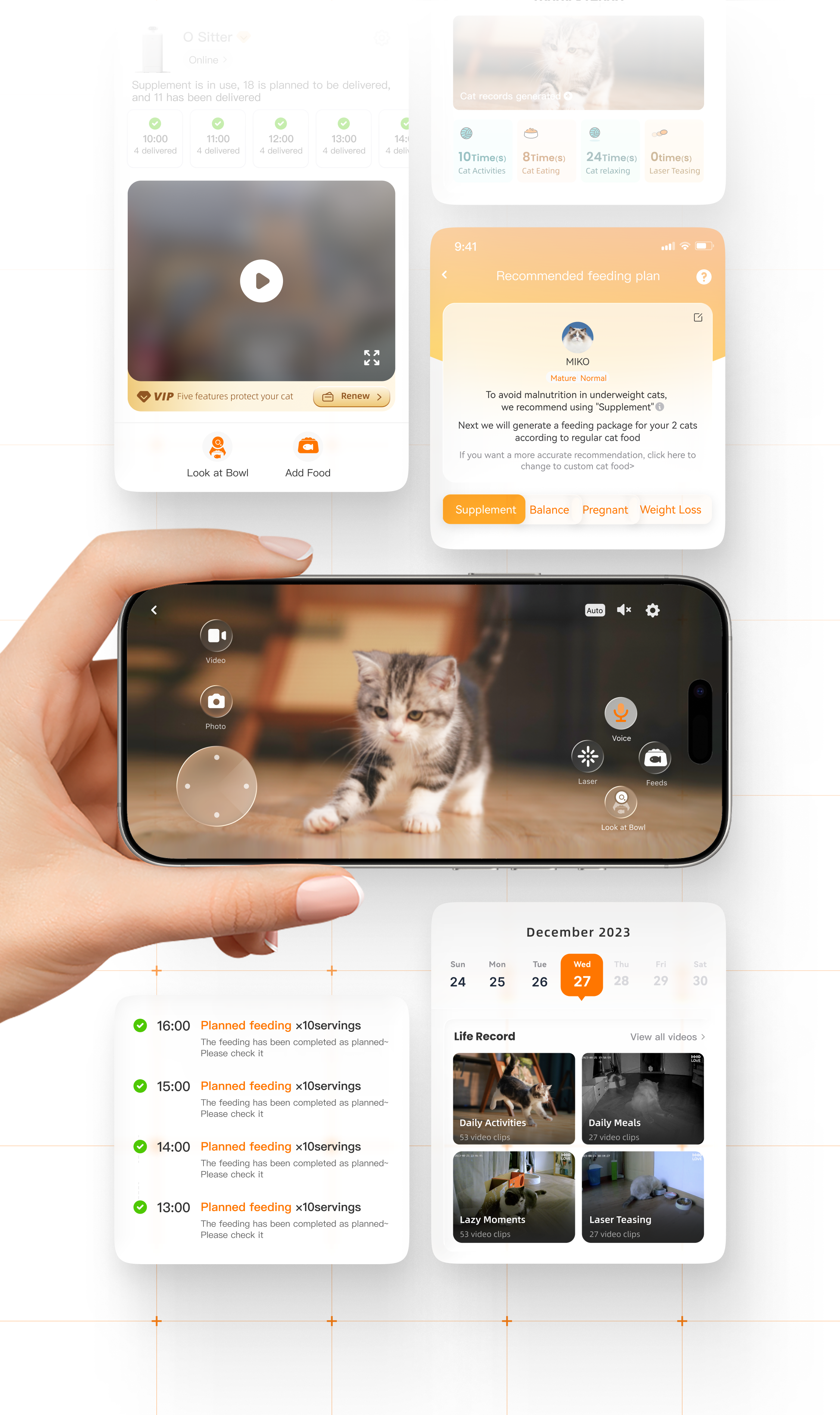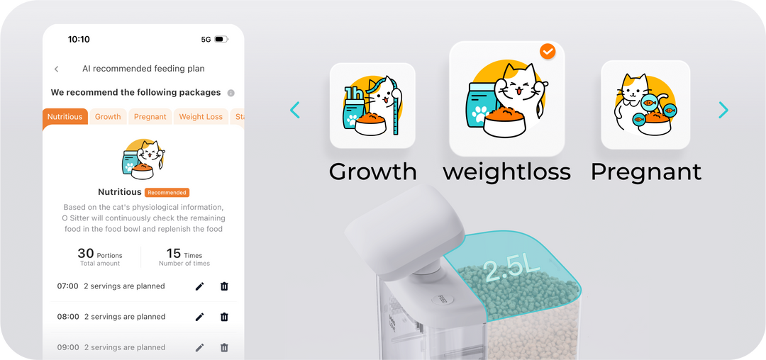 No more worries about running out of food. O Sitter will alert you when food is running low. Plus, O Sitter will see the food bowl when time to feed and not dispense if food is still enough in the bowl. For any green hand, just input your cat’s basic information and O Sitter will automatically recommend a feeding plan to you, making cat care a breeze.